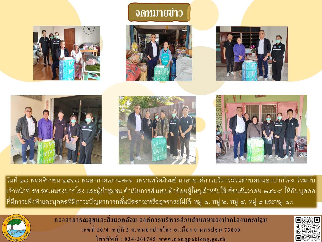 วันที่ 27 - 28 พฤศจิกายน2568 พลอากาศเอกนพดล เพราเพริศภิรมย์ นายกองค์การบริหารส่วนตำบลหนองปากโลง และนายบุญจง บุญรอด รองนายกองค์การบริหารส่วนตำบลหนองปากโลง ร่วมกับเจ้าหน้าที่ รพ.สต.หนองปากโลง และผู้นำชุมชนดำเนินการส่งมอบผ้าอ้อมผู้ใหญ่.