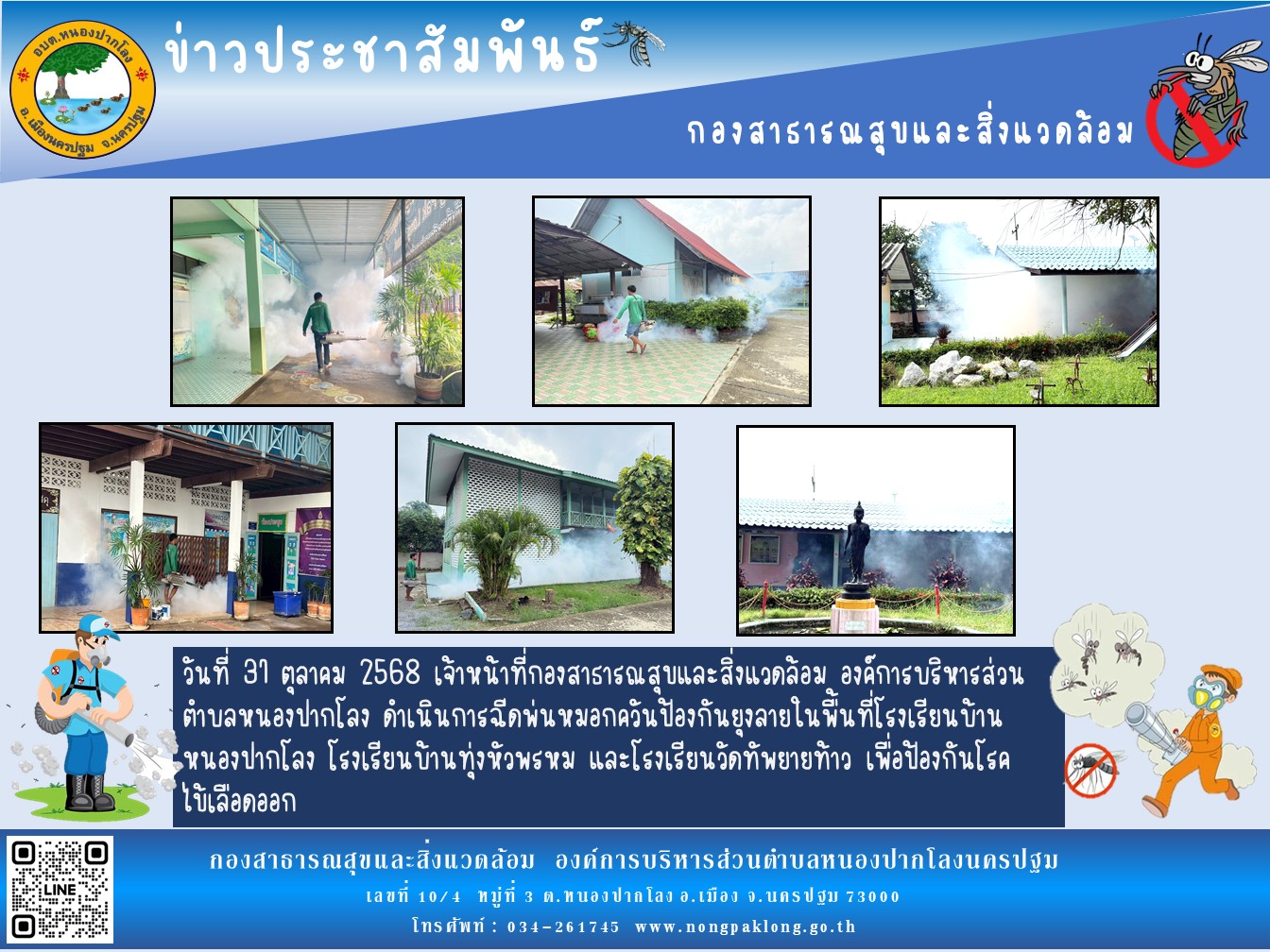 วันที่ 31 ตุลาคม 2568 เจ้าหน้าที่กองสาธารณสุขและสิ่งแวดล้อม องค์การบริหารส่วนตำบลหนองปากโลง ดำเนินการฉีดหมอกควันป้องกันยุงลายในพื้นที่โรงเรียนบ้านหนองปากโลง โรงเรียนบ้านทุ่งหัวพรหม และโรงเรียนวัดทัพยายท้าว เพื่อป้องกันโรคไข้เลือดออก